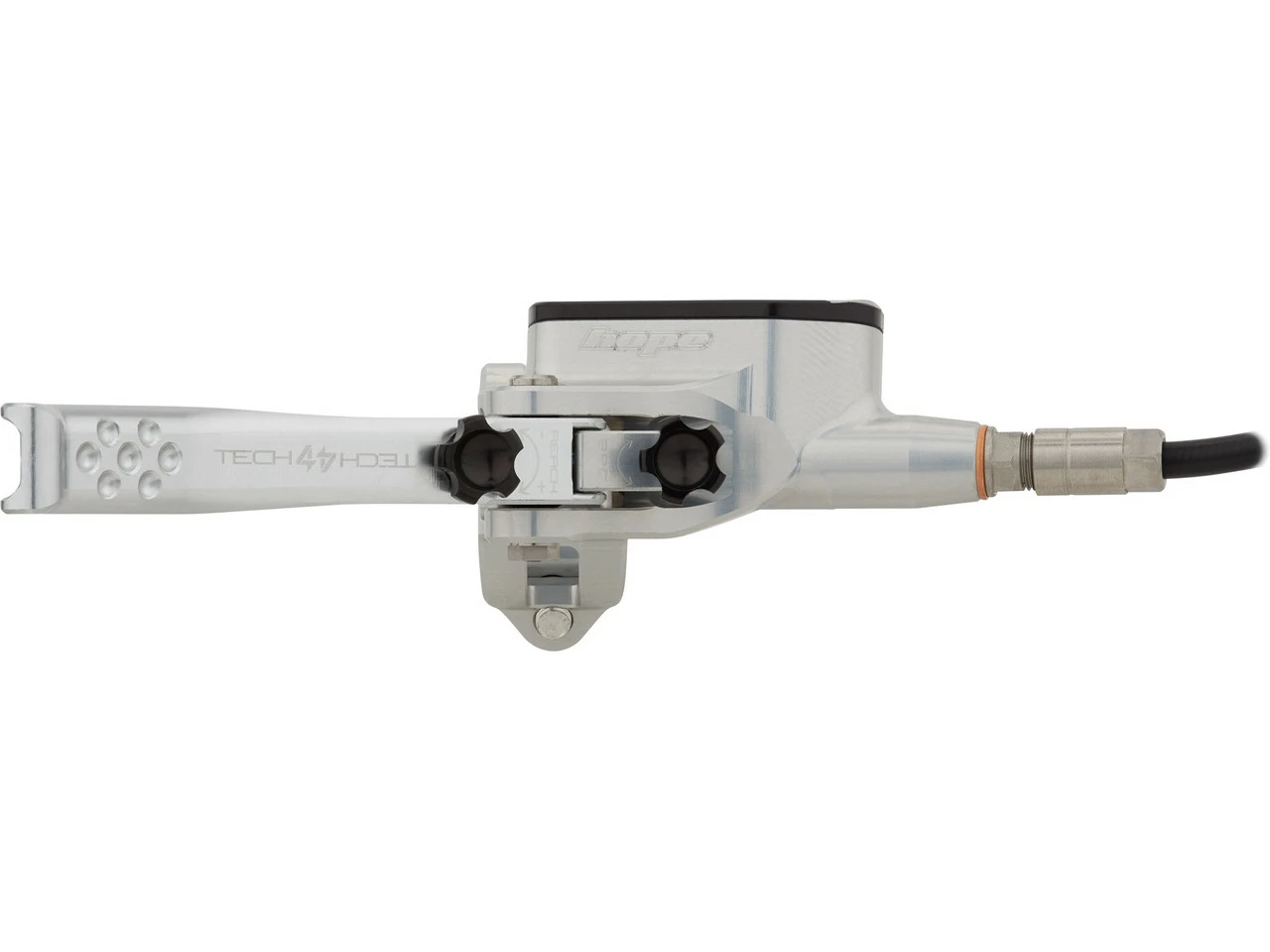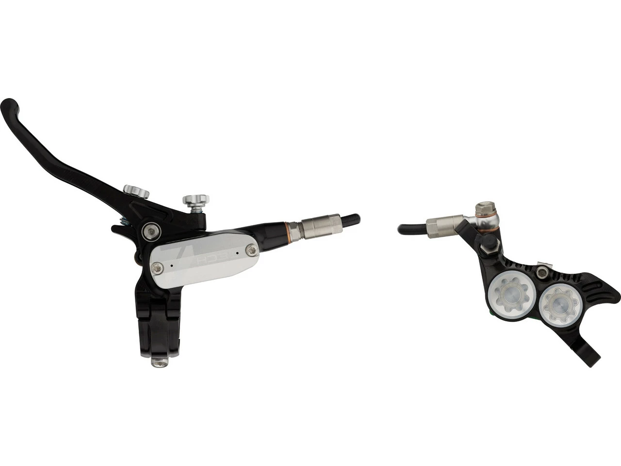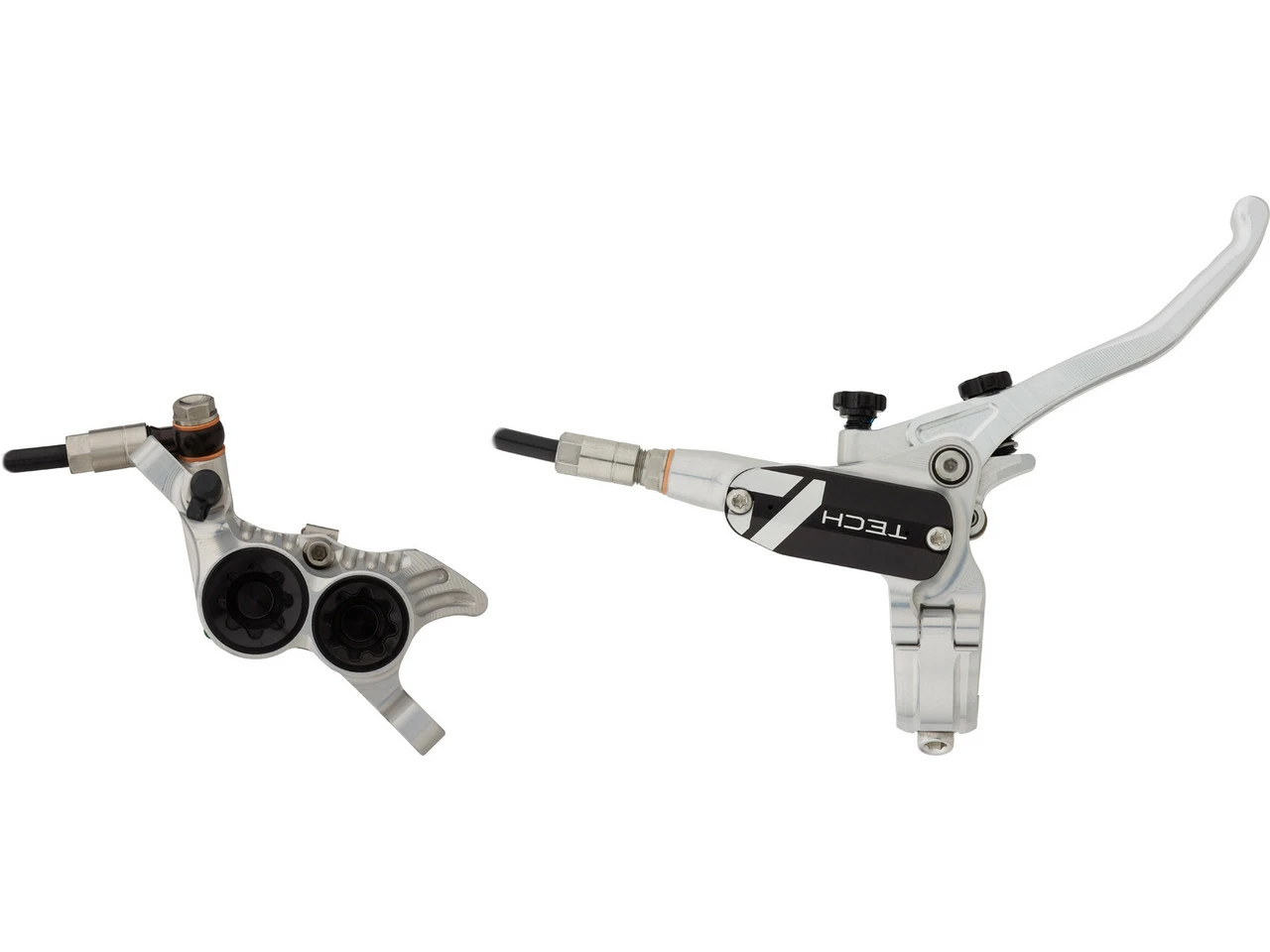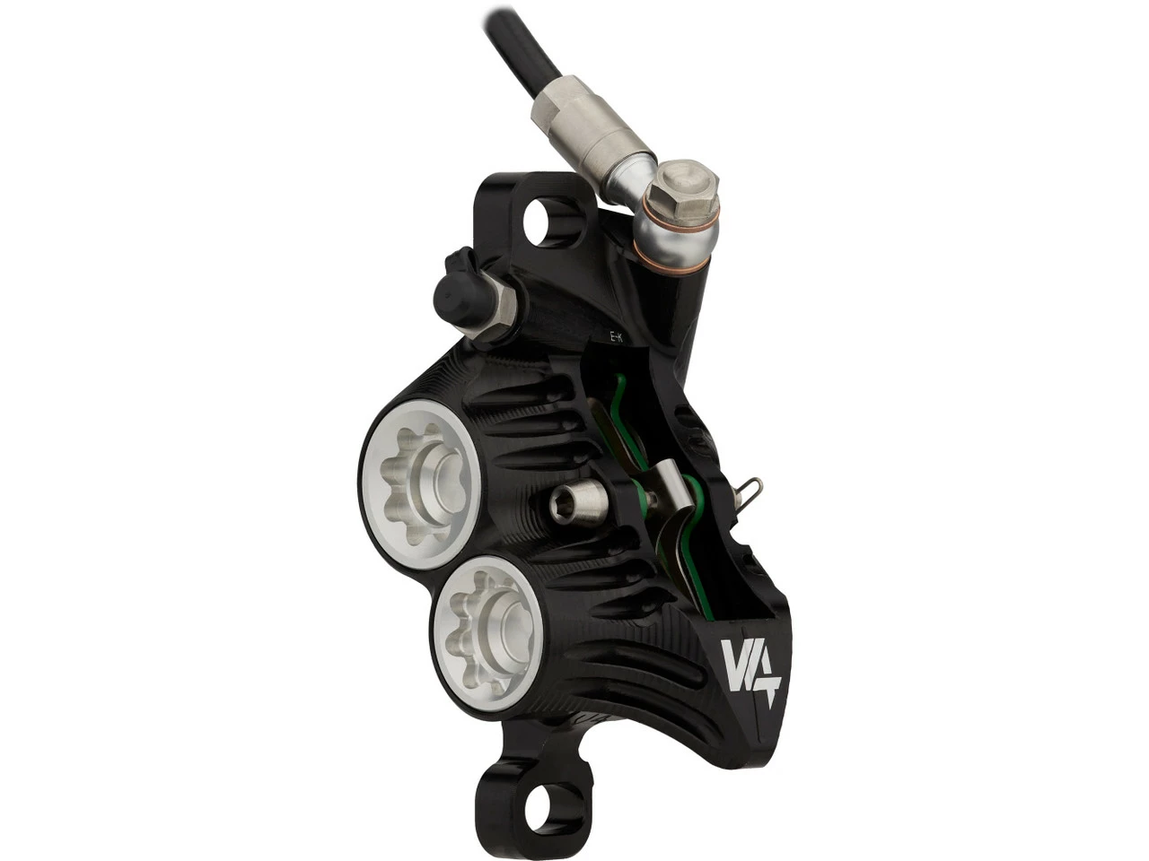 Spezifikationen:Einsatzbereich:Downhill, Dirtjump & SlopestyleBremsentyp:hydraulisch, 4-KolbenBremsmedium:DOT 5.1Leitung:KunststoffLeitungslänge VR/HR:1600 mmTechnische Daten Bremssattel:Montage Bremssattel:PostmountBremsbelag:Racing Organic Grade ResinBauweise:einteiligMaterial Bremssattel:AluminiumMaterial Kolben:Edelstahl, PhenolLeitungsanschluss:BanjoTechnische Daten Bremsgriff:Hebellänge:1-FingerEinstelloptionen:Griffweiteneinstellung, DruckpunktMontage:Klemmschelle (geteilt)Bauart:rechts (seitenspezifisch), links (seitenspezifisch)Material Bremshebel:AluminiumMaterial Bremsgriffgehäuse:AluminiumLeitungsanschluss:GeradeFeatures:hohe Bremspower für Bremsscheiben mit bis zu 220 mm DurchmesserPhenol-Einsätze in den Kolben und Kühlrippen am Sattel verhindern Überhitzungweiterentwickelte Technik mit deutlich mehr Druck verglichen mit Tech 3CNC-gefräster einteiliger BremssattelRollenlagerung im Hebelmechanismus verringert ReibungDruckpunkt und Hebelweite werkzeugfrei jederzeit anpassbarergonomische Hebelform für besseren Grip und weniger Ermüdungserscheinungenverstellbarer Hebelwinkelgeteilte Klemmschellekürzbare KunststoffleitungHinweis des Herstellers:Der V4 Bremssattel ist aufgrund seiner Bauweise