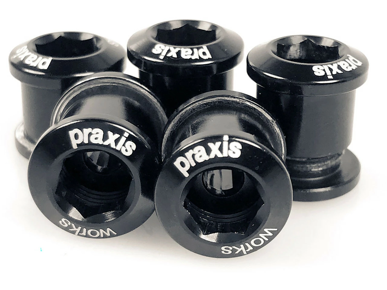 Die Praxis Works Road Kettenblattschrauben (M8,5 x 0,75) bestehen aus Aluminium und lassen sich mit einem 5 oder 6 mm Innensechskantschlüssel anziehen bzw. lösen. Ein weißer Schriftzug weist sie als Original-Ersatzteile aus. Es werden 5 Stück geliefert.