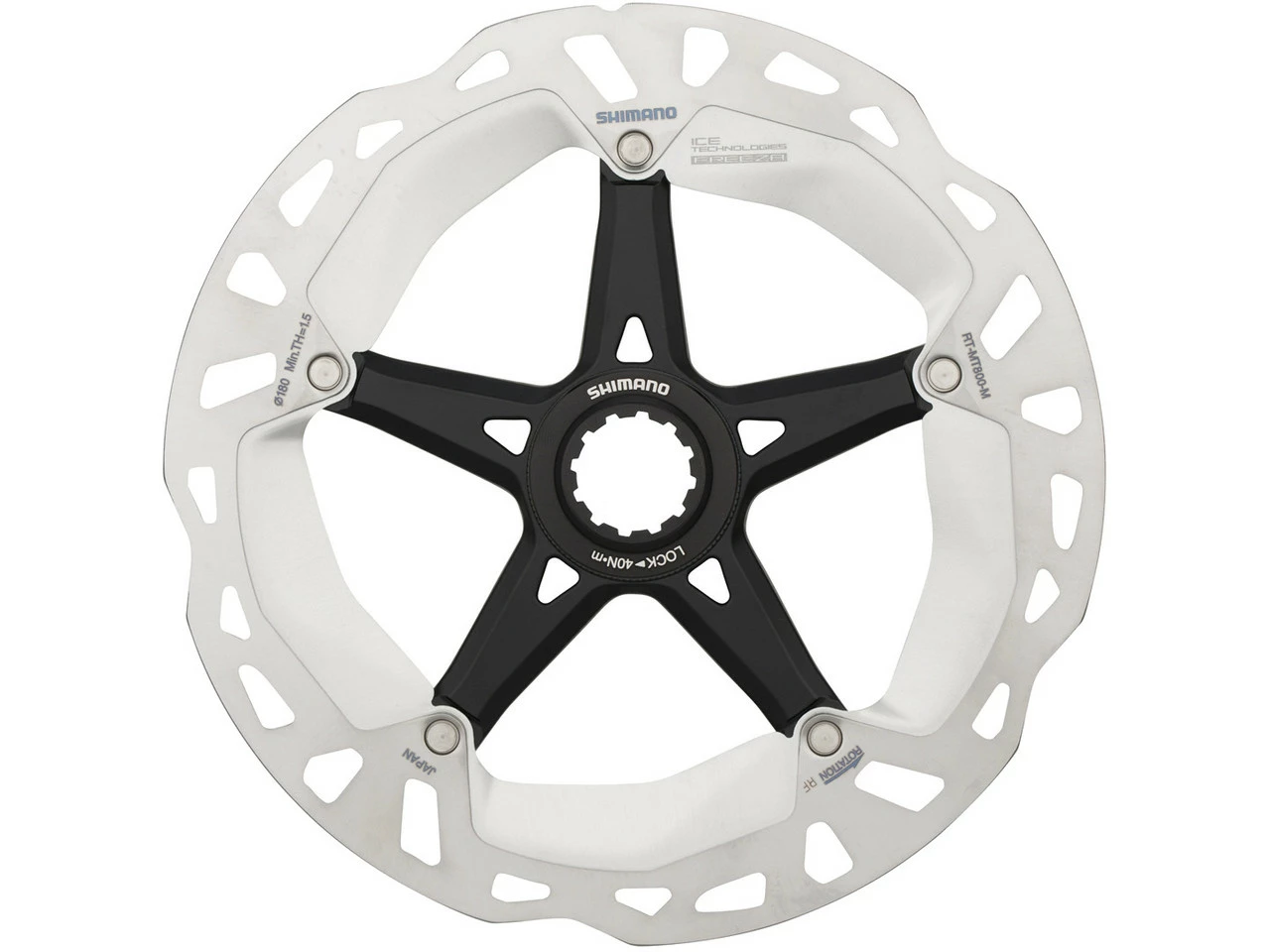 Die Shimano RT-MT800 Bremsscheibe mit Lockring mit interner Verzahnung (Internal Serration) verringert dank Ice Technologies FREEZA Wärmeableitung die Temperaturen nochmals deutlich, woraus eine konsistentere Bremsleistung folgt. Auch die Lebensdauer der Bremsbeläge wird verlängert. Die bewährte Sandwich-Konstruktion der RT-MT800 mit Aluminium-Kern zwischen zwei Edelstahlschichten gewährleistet effizienten Hitzeabgang über die integrierten Kühlrippen.